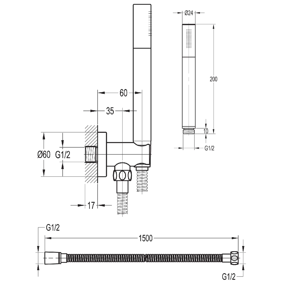 Annecy handset kit with KI036 handset, KI201 hose and wall bracket outlet elbow