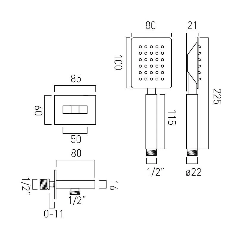 Aquablade Square Single Function Handset with Hose and Bracket with Integrated Outlet